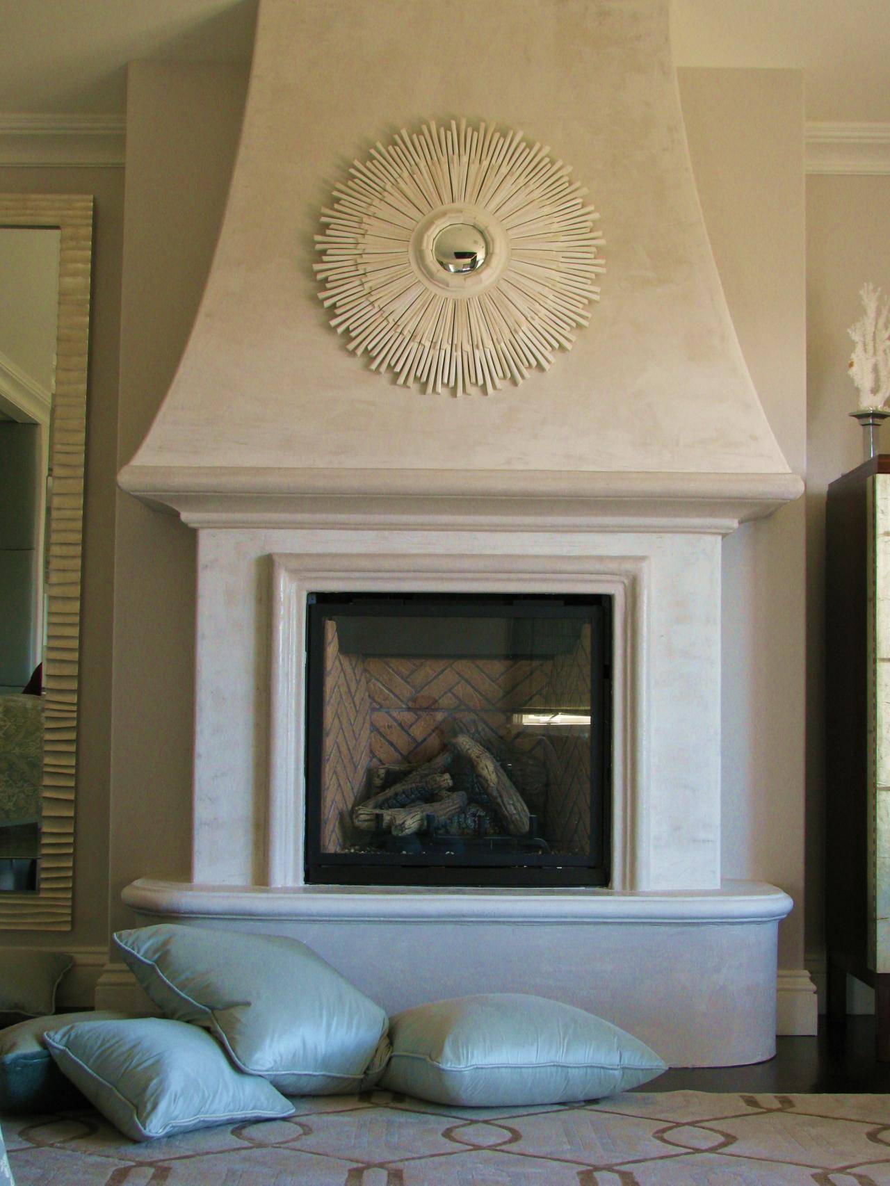 Отделка очага штукатуркой – процесс не сложный и не дорогой. Подойдет для сооружений, полностью выполненных из кирпича, бетона. Данное оформление не утяжеляет объект, потому дополнительно усиливать фундамент не нужно. Штукатурный слой, предназначенный для последующей чистовой отделки, немного отличается от декоративного варианта. При смене интерьера конструкцию легко перекрасить в другой цвет, соответствующий колеру обстановки. Минус такой отделки – при накладывании толстого слоя требуется армирование, а также длительная просушка.