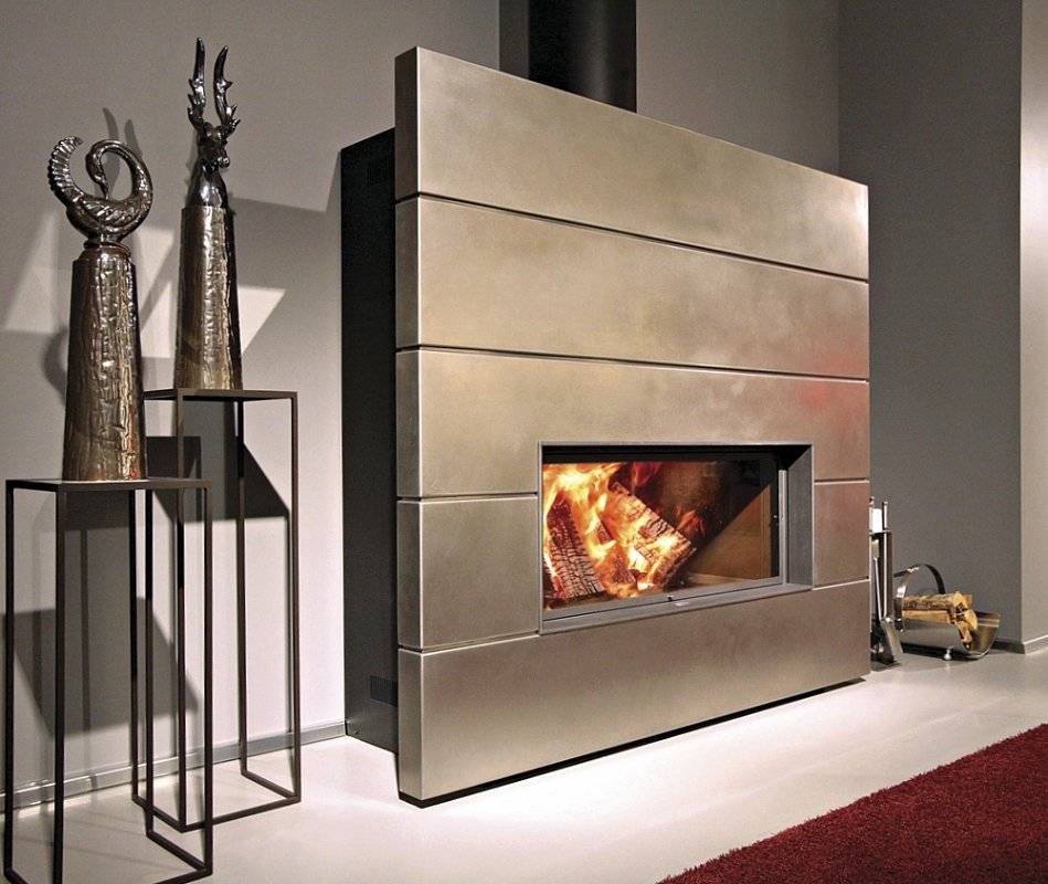 Оформление очага путем обшивания металлическими листами подойдет для многих современных интерьерных стилей. Наиболее популярна отделка из нержавеющей стали, меди и латуни, техника украшения – протяжка, чеканка (в том числе ручная), художественное травление, плазменная резка. Металлы легко сочетать с природным либо искусственным камнем, штукатуркой. Несомненные плюсы такой отделки – сравнительно малый вес деталей, возможность оформить камин практически в любом интерьерном стиле (ретро, классика, хай-тек и др.), не перестраивая его полностью. Отдельно стоящее сооружение, полностью выполненное из металла, легко подключить, разместить в любой точке пространства. Главные минусы – вероятность получить серьезные ожоги при касании металлической поверхности, неравномерность нагревания помещения, быстрое остывание.