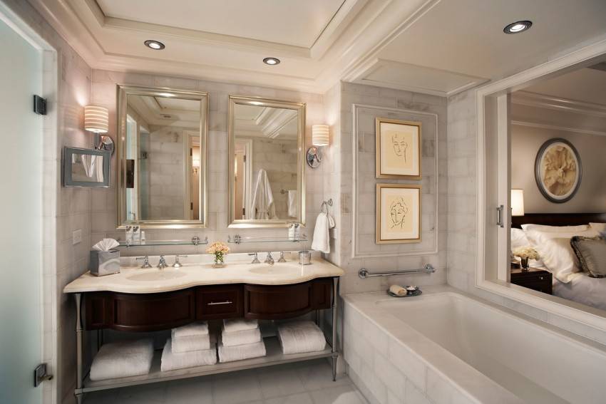Но если площадь позволяет, то ванна может находиться хоть в центре ванной комнаты. Для экономии места можно установить угловую душевую кабину.