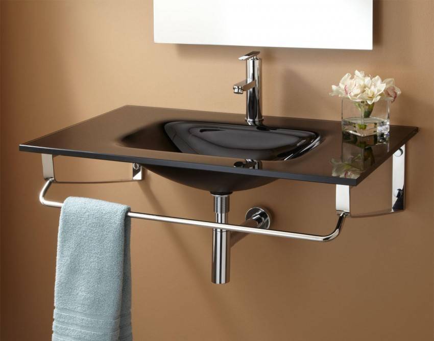Все, что нужно для установки раковины, включая крепежные элементы, обычно имеется в комплекте к эксклюзивному дизайнерскому сантехническому оборудованию. Для придания ему более презентабельного внешнего вида детали покрывают составами, имитирующими металлические или керамические покрытия.