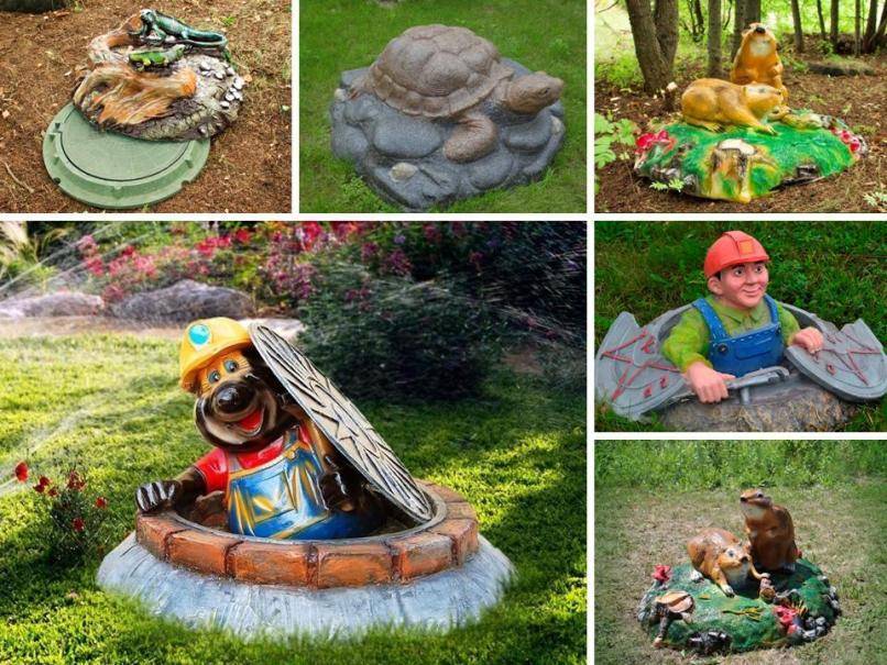 Крышка канализационного люка или септика — удачное место для размещения так любимых дачниками садовых фигурок и скульптур.