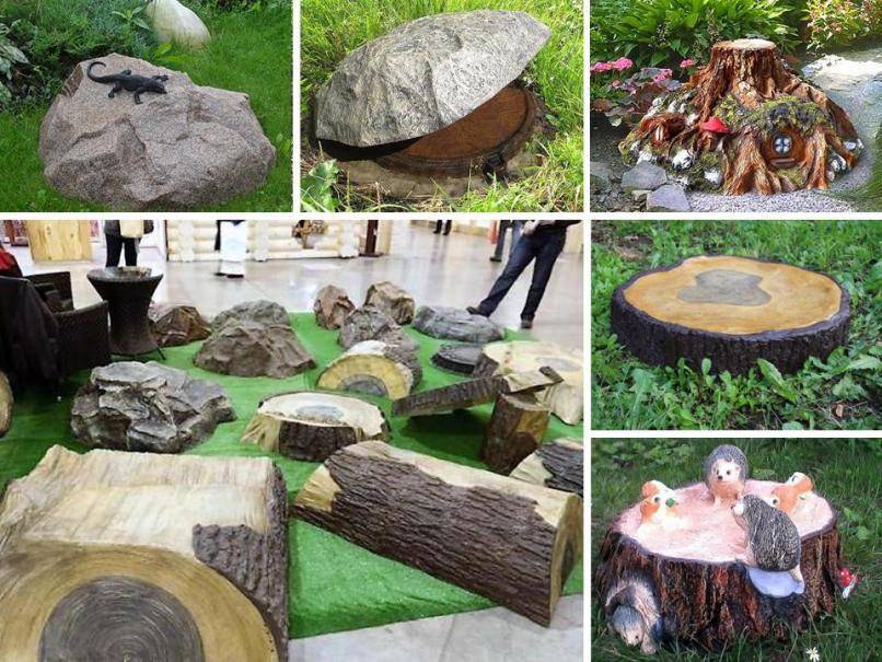 Декор септиков рукотворными пнями и камнями — универсальное решение, которое подходит для любого ландшафта. Изготавливаются они разных размеров и могут быть использованы для маскировки и других «непрезентабельных» моментов на даче. Подобные конструкции имеют небольшой вес, так что их несложно доставить, установить и перемещать при необходимости. Продолжительный срок службы и невысокая стоимость — последние аргументы в пользу приобретения искусственного пня или камня.