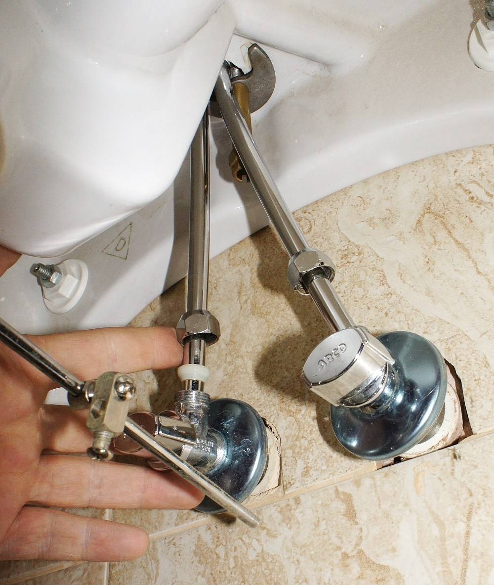 - Найдите участок, соединяющий гибкий шланг с внутриквартирными трубами холодной и горячей воды, потом посредством рожкового или разводного ключа открутите их.