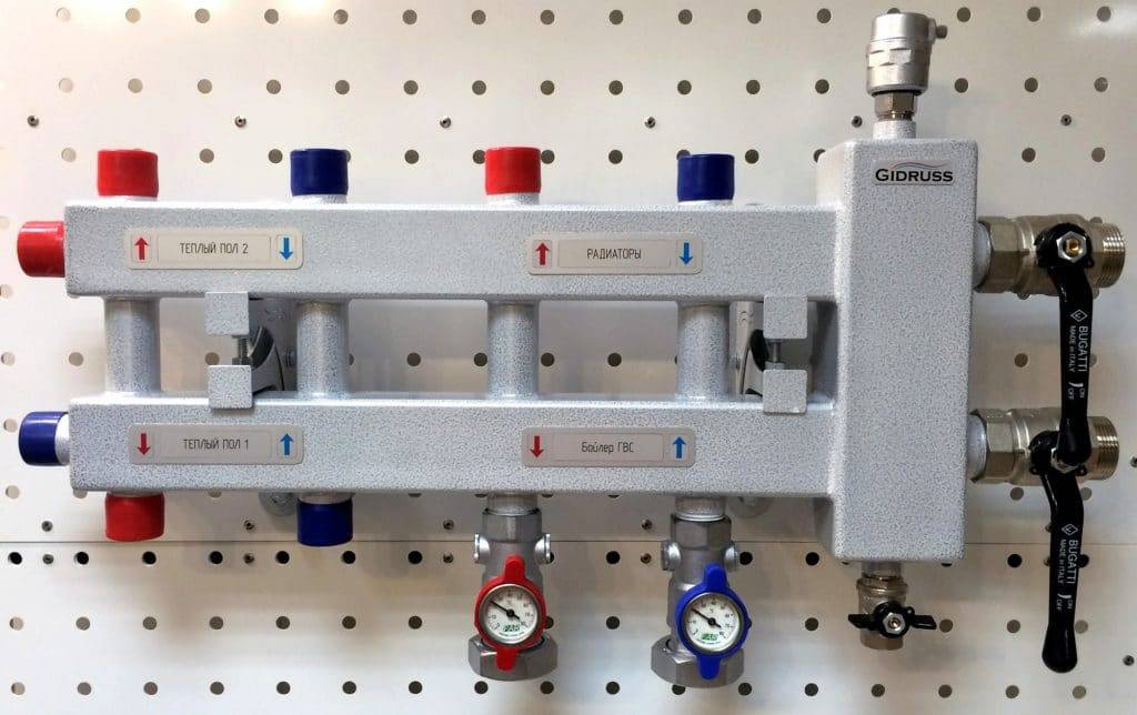 Распределительная гребенка облегчает эксплуатацию и ремонт оборудования. Запорная и регулирующая арматура системы теплоснабжения дома находится в одном месте. Увеличенный диаметр коллектора обеспечивает равномерный расход между отдельными контурами.