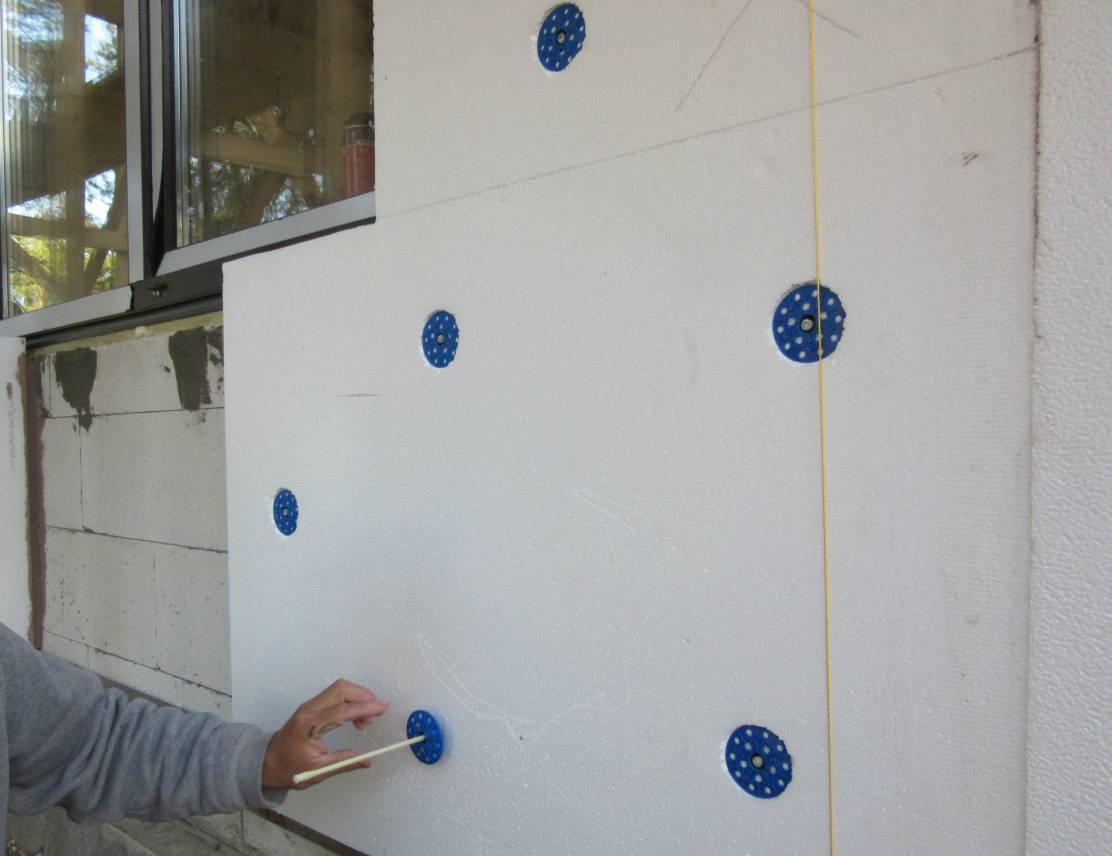 - Для фундаментного утеплителя плиты следует приклеивать к бетону цоколя и прикреплять монтажным креплением.
