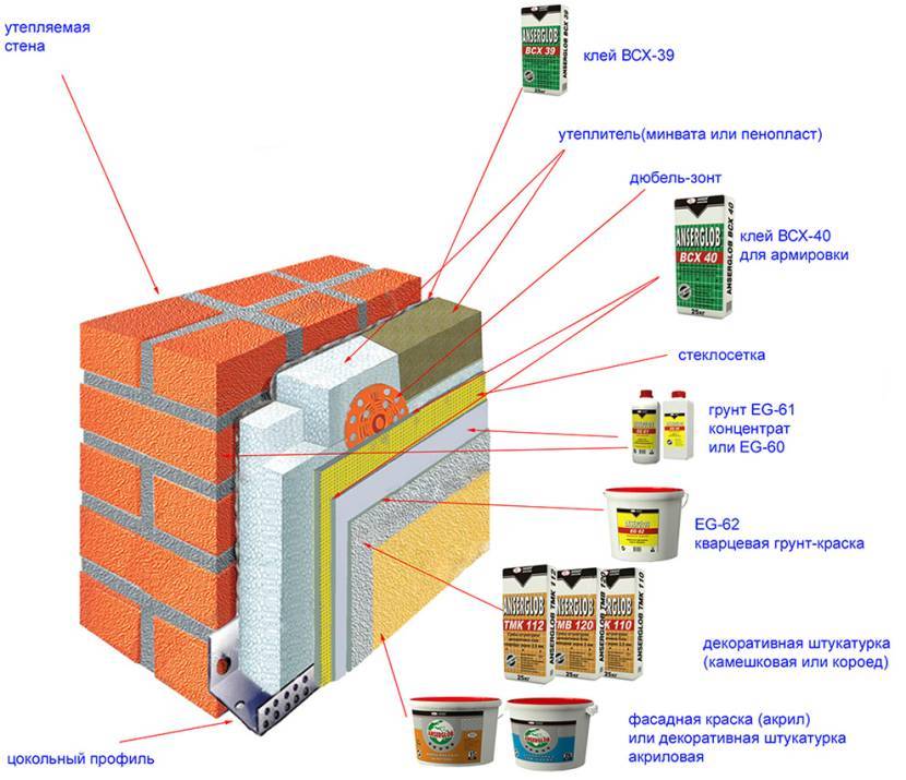 Любая система теплоизоляции, в том числе и «мокрый фасад», представляет собой своеобразный слоеный пирог, где монтаж каждого слоя проводится поэтапно.