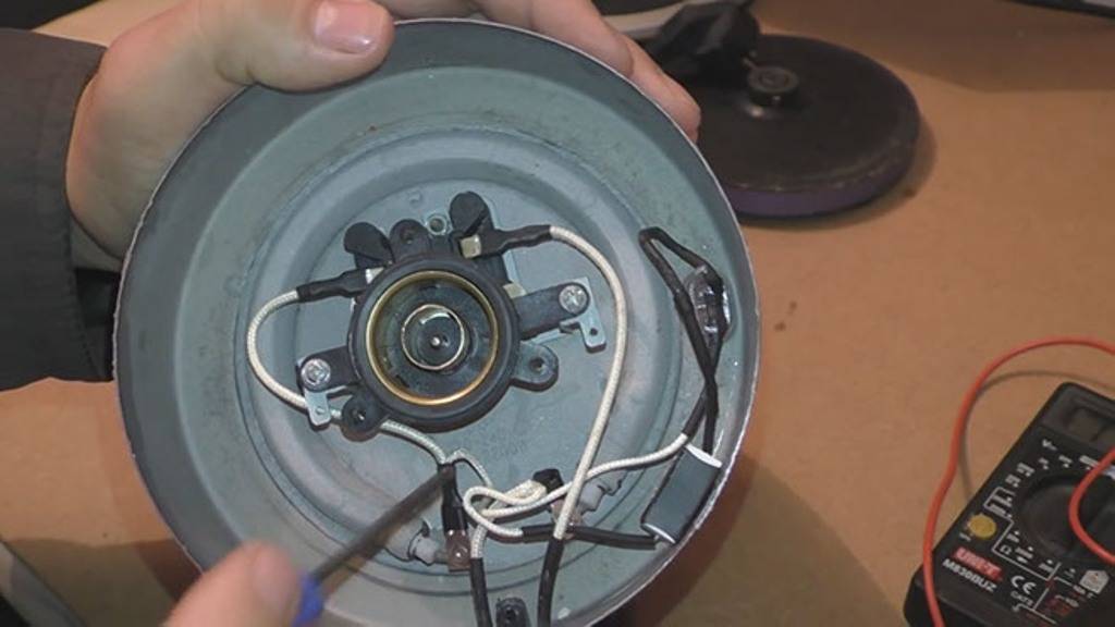 Причина неработающего электрического чайника может скрываться и в подставке. Там особо и ломаться нечему. Есть только контактная группа и выводы от неё, к которым подключается электрический шнур. Всё это может тут сломаться — это отвалиться провод или окислиться место контакта.