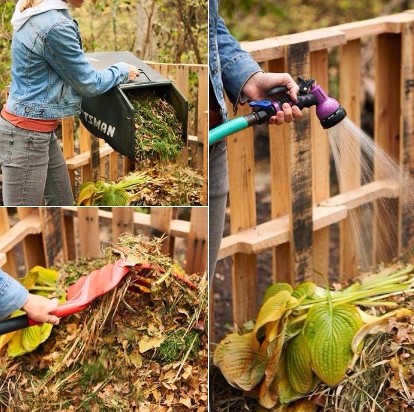Периодически увлажняем будущий компост, чтобы не допускать его пересыхания. При создании компостной кучи вставляем в нее толстые палки, которые со временем вынимаем. Оставленные ими отверстия будут служить для увлажнения и вентиляции ее содержимого до самого основания. Поверхность горки делаем углубленной, а не выпуклой. Такой прием позволяет воде собираться на её поверхности и лучше увлажнять все слои содержимого.