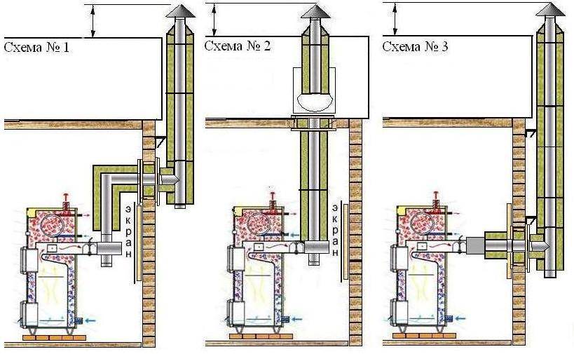 Места подключения, прокладки и прохождения трубы через стены или перекрытия изолируют огнеупорным материалом, предотвращающим перегрев отделки. Для этих целей используют истовой металл или асбестоцемент.