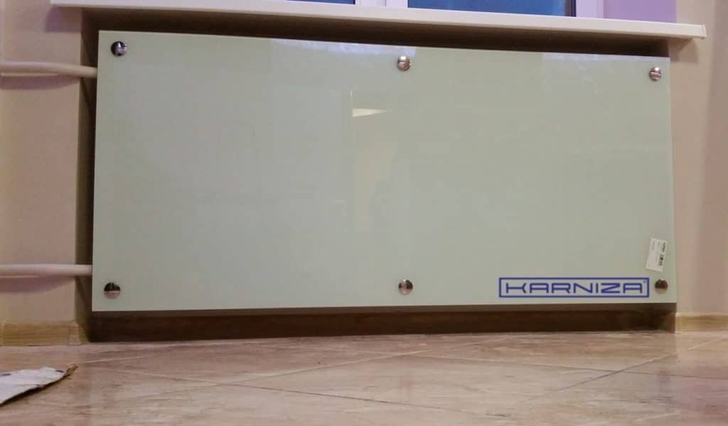 Стеклянные модели относятся к классу элитных изделий, поэтому стоят дорого. Их можно оснащать светодиодной подсветкой, декорировать рисунками. Выполняется экран на батарею своими руками из прочного закаленного стекла.