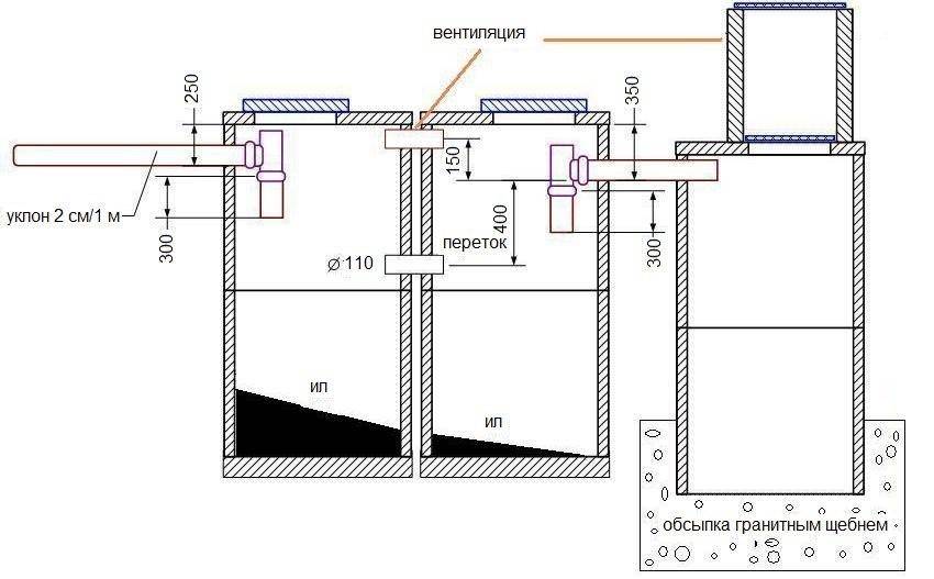 Схема автономной канализации для частного дома с использованием трех колодцев из бетонных колец