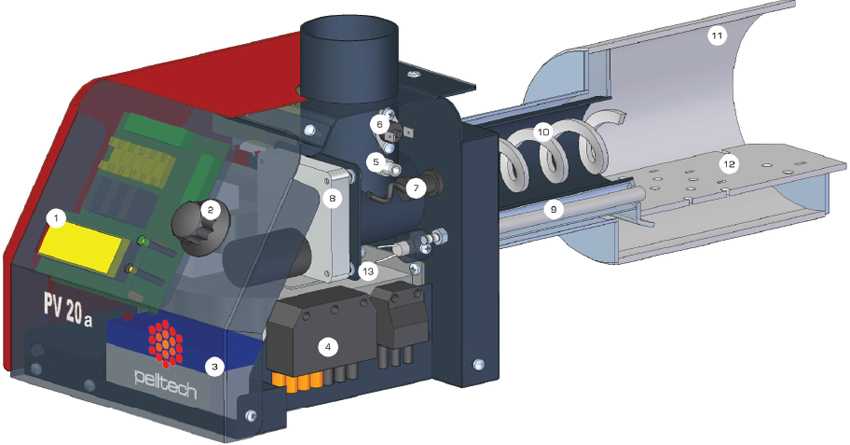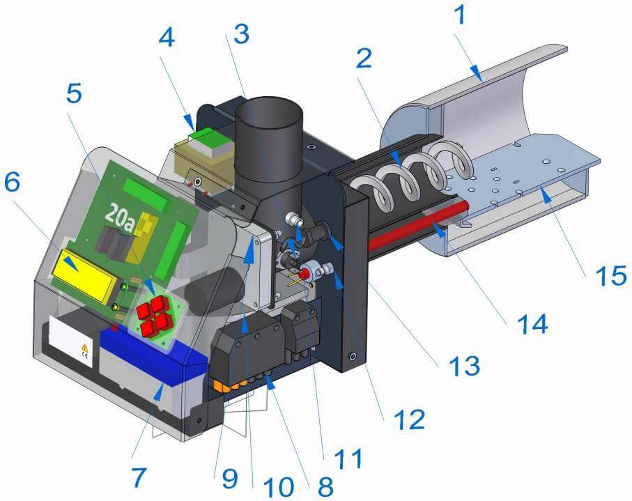 Устройство пеллетной горелки, где 1 – ЖК-дисплей, 2 – ручка управления, 3 – резервный аккумулятор, 4 – разъем соединительный, 5 – датчик уровня топлива, 6 – предохранительное термореле, 7 – фотодатчик, 8 – двигатель внутреннего шнека, 9 – запальник, 10 – шнек внутренний, топка, 11 – решетка сгорания, 13 – вентилятор.