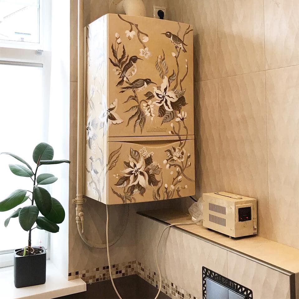 Один из простых и наименее затратных способов. С помощью различных декоративных элементов можно легко преобразить внешний вид водонагревателя и колонки. В качестве декора можно использовать наклейки, фото, живопись, роспись, разные орнаменты. Также можно сразу приобрести украшенную модель, чтобы не тратить лишнее время на самостоятельное декорирование.