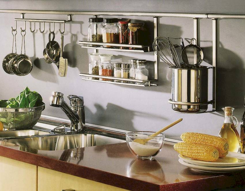 Полки, крючки и всевозможные держатели – неотъемлемая часть кухни, позволяющая сделать ее интерьер более функциональным. Согласно требованиям безопасности, на газовую трубу нельзя ничего вешать. Однако с помощью рейлинга можно создать иллюзию, благодаря которой коммуникации будут казаться частью общей картины. Для этого труба окрашивается в цвет, который максимально приближен к оттенку рейлинга. Чаще всего для этого используются медные, бронзовые цвета, а также оттенки, имитирующие хромированную поверхность.