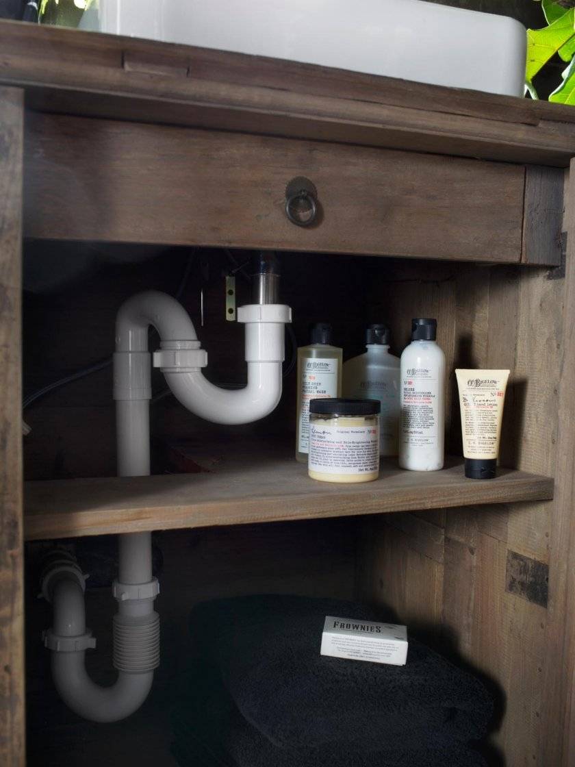 Полочки и шкафчики помогут замаскировать трубы в ванной. При установке шкафчиков в ванной комнате, необходимо, только вырезать заднюю стенку.