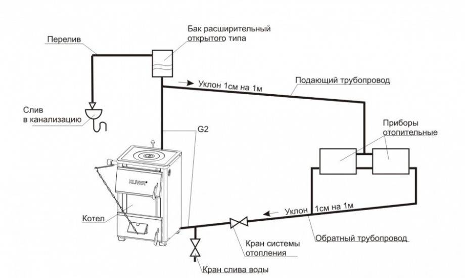 Схема открытого отопительного контура дает представление о том, в каком порядке следует заполнять такую систему водой после промывки. В самой верхней ее точке находится расширительный бак, а в нем — специальный патрубок. Его назначение — защита магистрали от перелива.