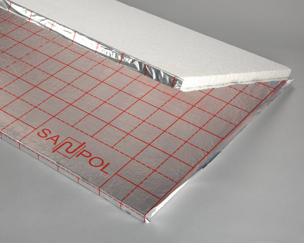 Чаще всего фольгированный пенополистирол используют для теплого пола. Алюминиевый отражатель перенаправляет тепловые потоки вверх на подогрев финишного напольного покрытия. Достигается экономия затрат на отопление – энергия не тратится на нагрев чернового пола и плит перекрытий.
