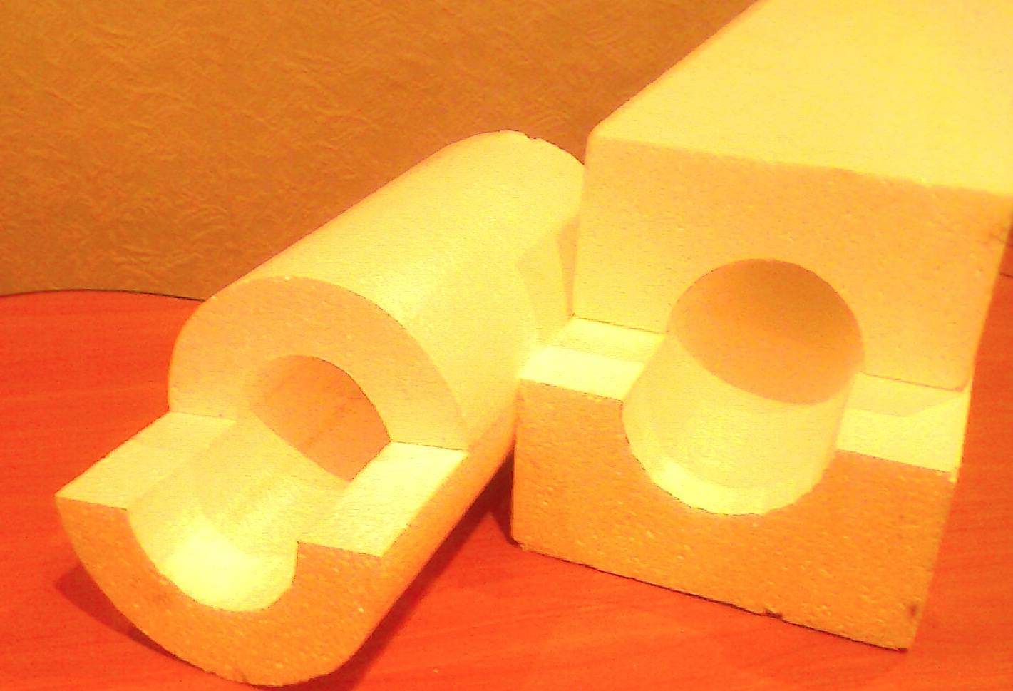 Материал изготавливается в виде полуцилиндров с внутренними выемками для трубы. Это создает определенный эффект «скорлупы». В работе пенополиуретан очень удобен. Его можно прибрести по доступной цене.