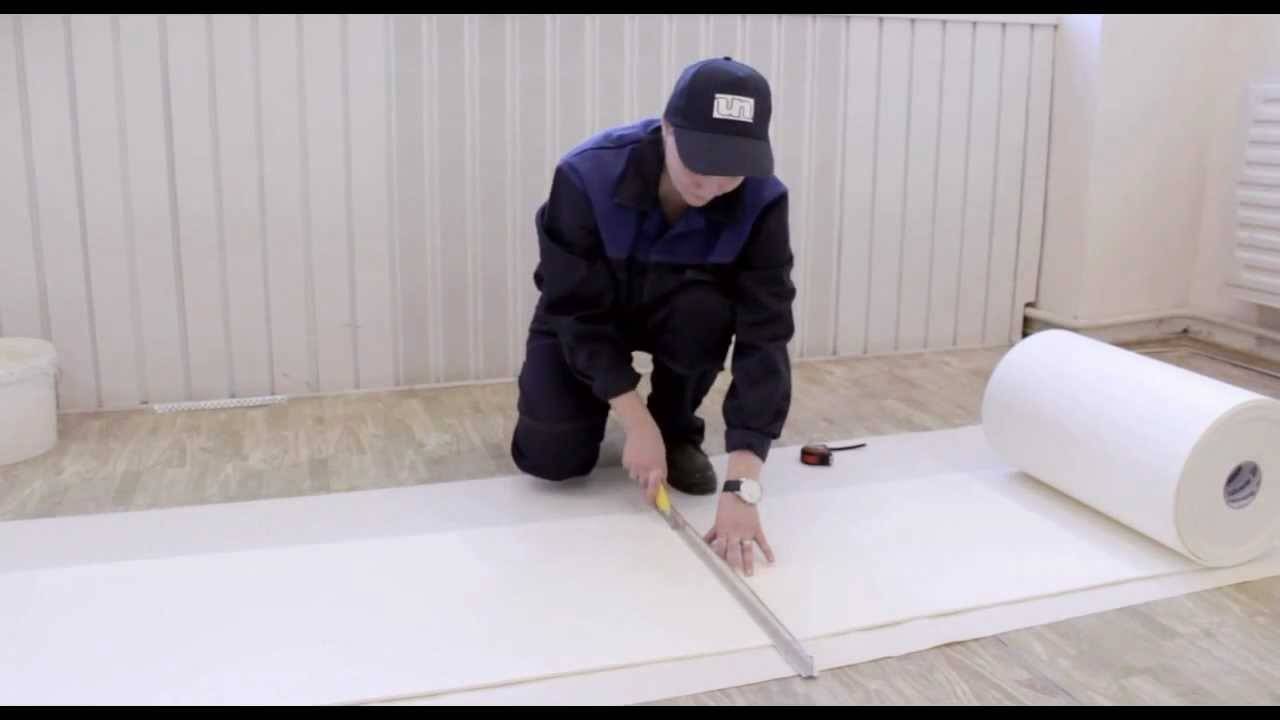 Рулон разматывается и нарезается на отдельные части по длине равные высоте стен. Клей наносится непосредственно на материал. Клеящий состав должен нормально впитаться в материал, и через 5-10 минут можно приступать к монтажу.