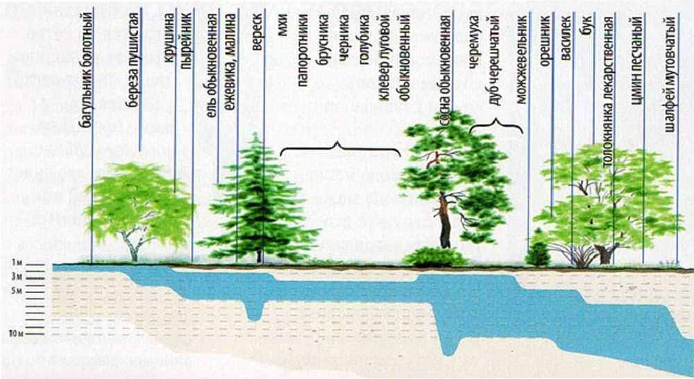Допустим, если одни травы любят засушливые места, то другие произрастают исключительно на влажных участках, с высоким уровнем подпочвенных вод. С помощью представленной таблицы можно определить уровень залегания воды по произрастающим на участке растениям.