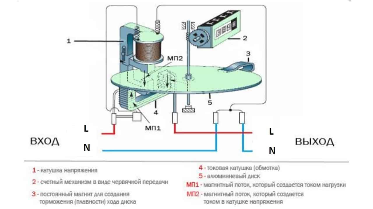 Принцип действия индукционного счетчика электроэнергии заключается в том, что при подключении в электрическую цепь на обмотку напряжения подается действующее номинальное напряжение. В случае подключения нагрузки к выводам электросчетчика через токовую катушку будет протекать определенная величина тока. При взаимодействии двух электромагнитных полей в алюминиевом диске начнут наводиться вихревые токи, что создаст его собственное электромагнитное поле. Механическое усилие от диска через систему шестеренок передастся счетному механизму.