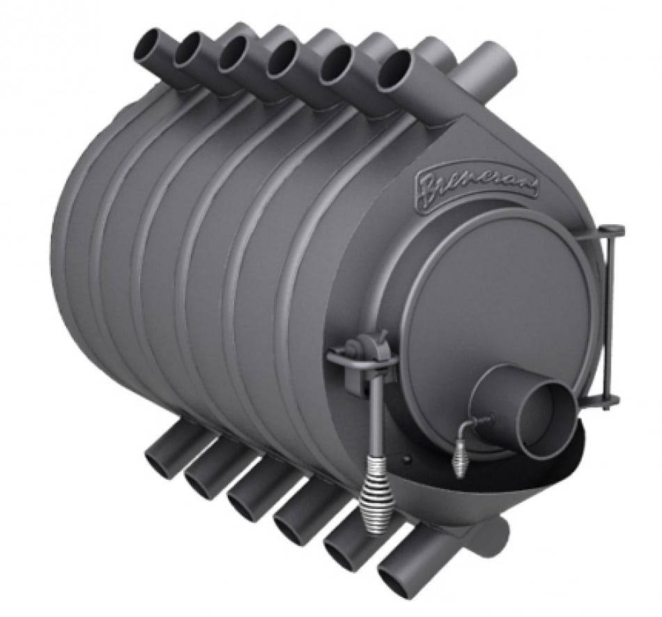 Печь Булерьян без водяного контура представляет собой бочкообразную конструкцию с торчащими внизу и вверху трубами. Эти трубы огибают со всех сторон камеру сгорания, образуя производительный конвектор, способный пропустить через себя до нескольких кубометров воздуха в час. Уже через полчаса после первичного розжига в комнате становится заметно теплее. Помимо воздушного конвектора в конструкции агрегата присутствуют: