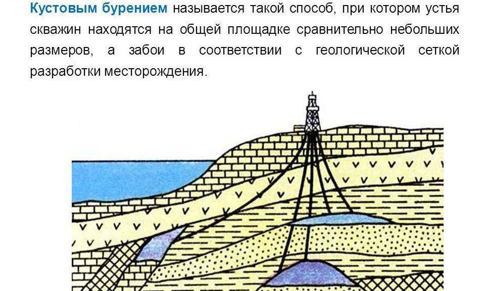 Такое название метод носит по той причине, что готовая схема устьев и забоев напоминает собой своеобразный куст. К одному устью сходятся скважины из нескольких забоев, сгруппированных на одной площадке. В случае такого метода значительно сокращаются монтажные и подготовительные работы, снижается количество рабочих транспортных сообщений, линий электропередач и подачи воды.
