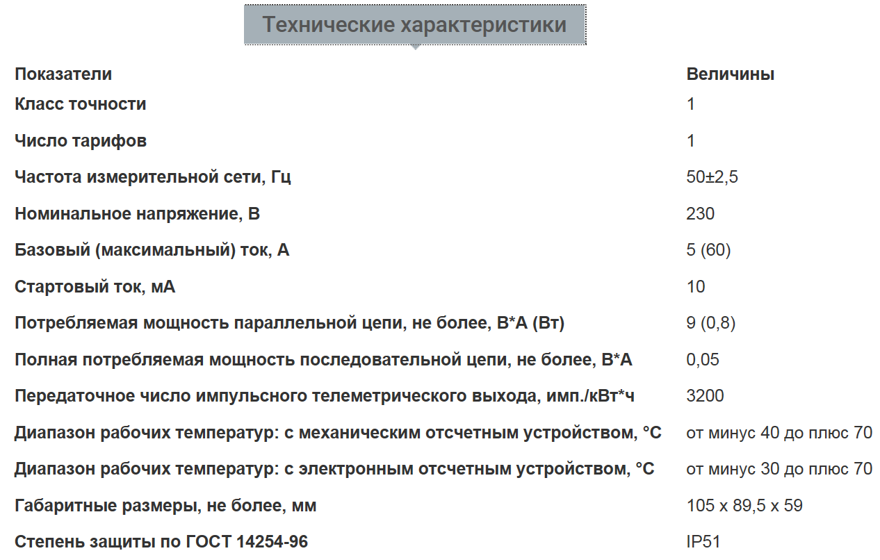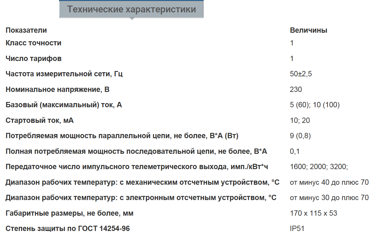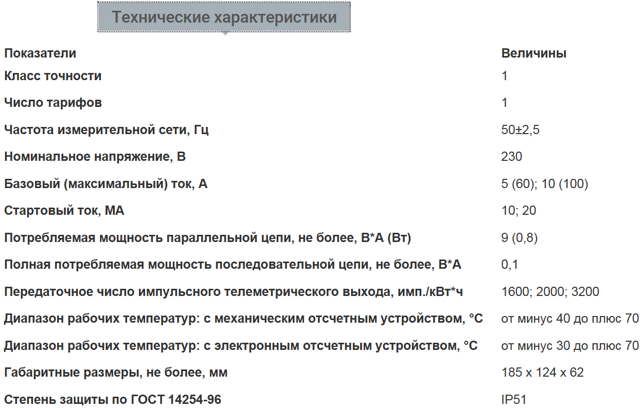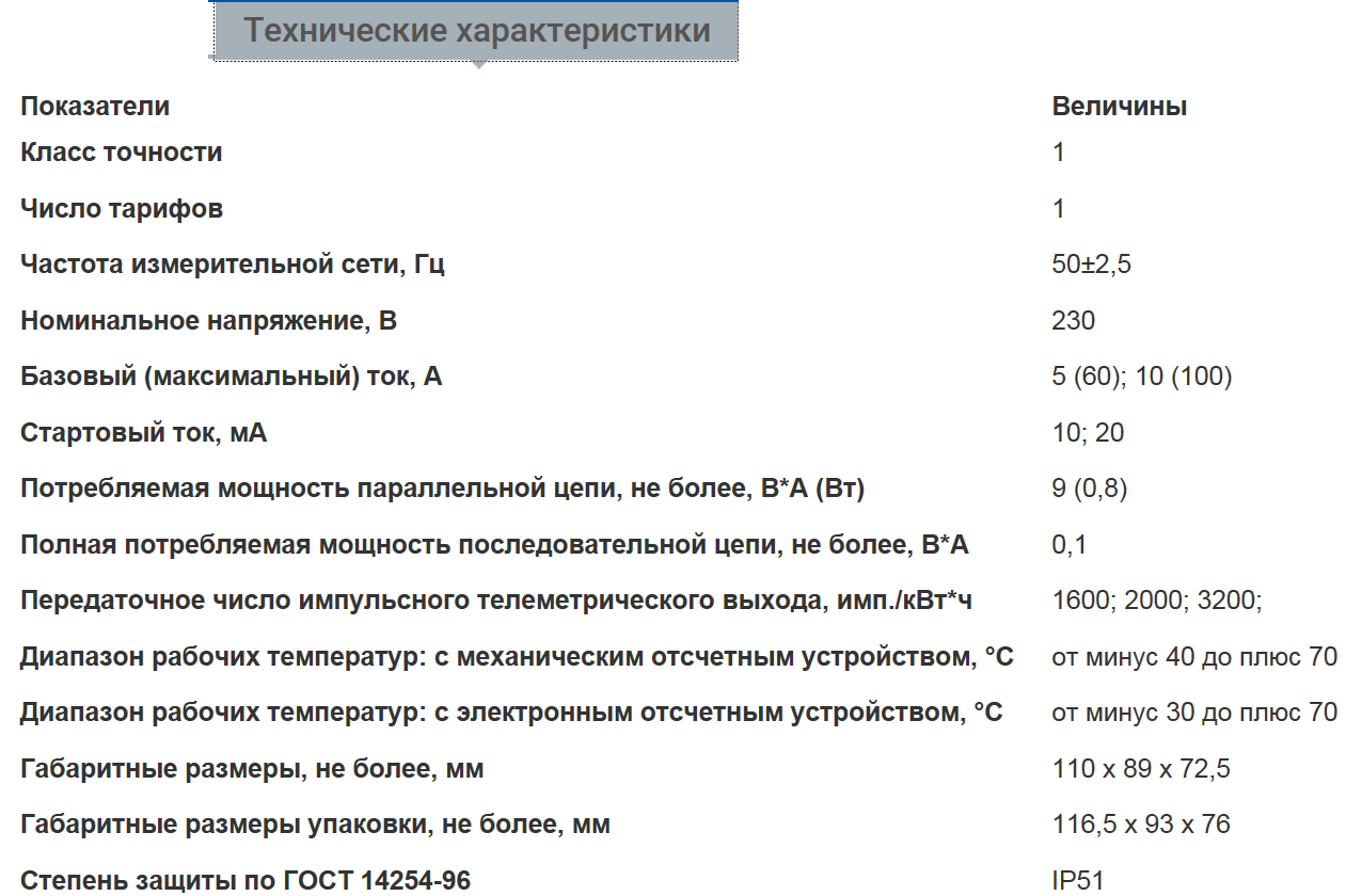 Класс точности энергомера соответствует государственным стандартам. Базовый показатель тока – 60 ампер. Потребление мощности цепью напряжения не превышает показателя 0, 8. Полная мощность – 0, 1. Вес конструкции – 0, 6 кг.
