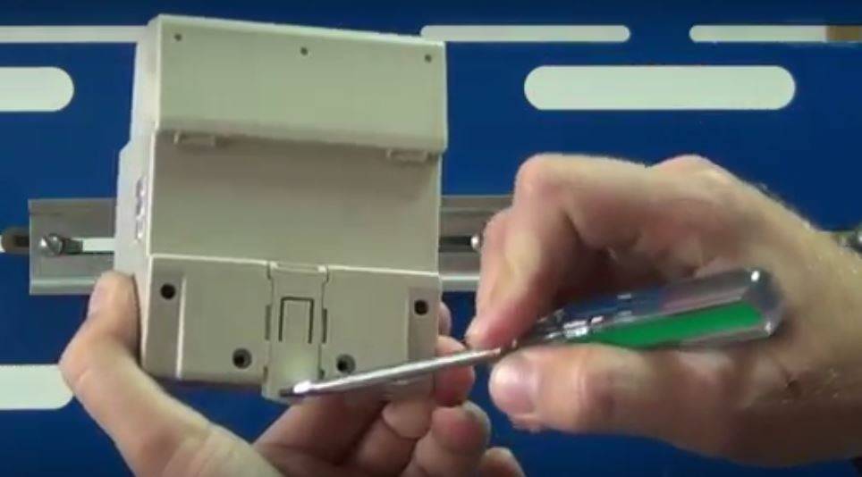 Перед надеванием на DIN-рейку отверткой отодвигается защелка, расположенная посередине паза для рейки. После завершения позиционирования прибора защелка вручную возвращается в исходное положение.