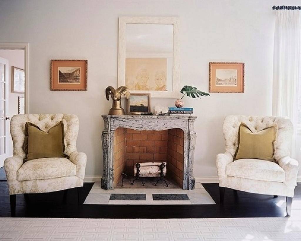 Декоративный портал на стене или в углу комнаты можно дополнить пламенем свечей, установив в топке биокамин с настоящими язычками пламени или поставив там обогреватель, стилизованный под горящие поленья. В любом случае искусственный очаг будет выглядеть не хуже, чем самый настоящий, а выполнять функции декоративного элемента в интерьере сможет даже лучше. Ведь для разжигания огня не потребуется ни дров, ни угля, которые могут испачкать ковер или пол.