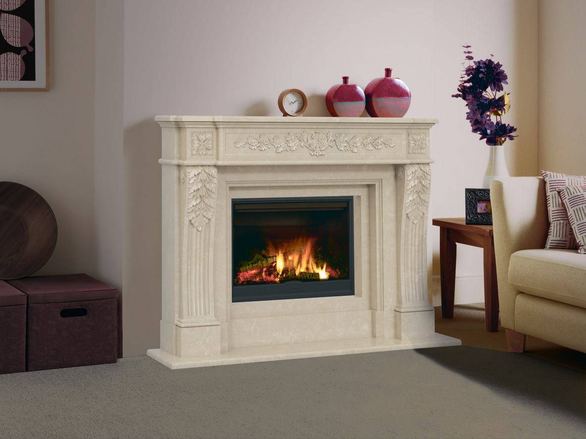 Декоративный камин с оформлением объёмными узорами и элементами имеет ряд своих уникальных преимуществ: