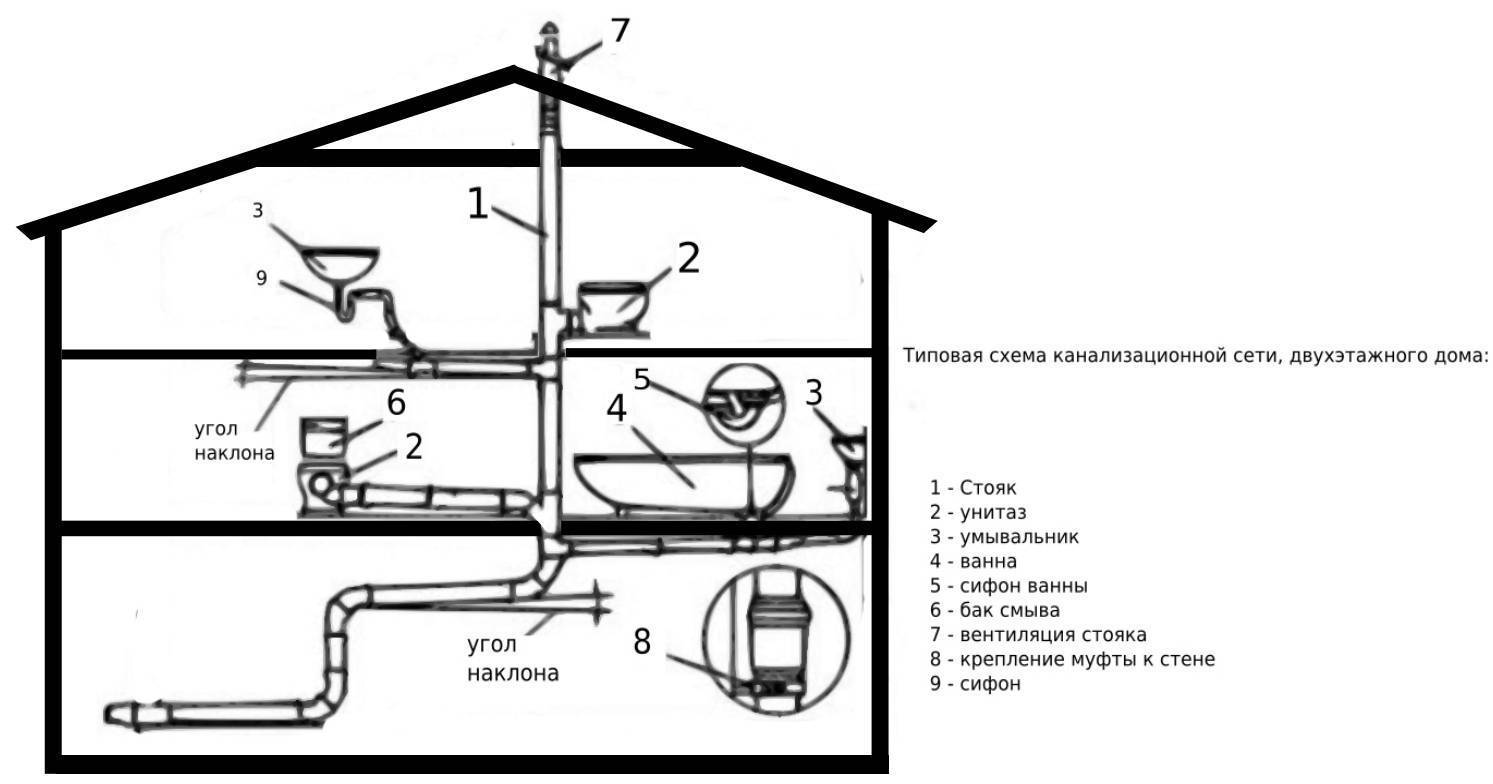 Труба для подключения патрубка унитаза должна быть диаметром не менее 10 см, подключение при этом осуществляется напрямую. В то же время для того чтобы подключить раковину и/или ванну, достаточно диаметра 5 см. Угол, под которым прокладываются трубы, должен обеспечивать самотёк.