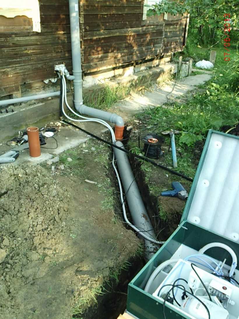 Теперь нужно объединить все 3 вышеописанные части в единую систему. После чего, проводятся пусконаладочные работы и пробный пуск системы. На этом устройство канализации на даче завершено.