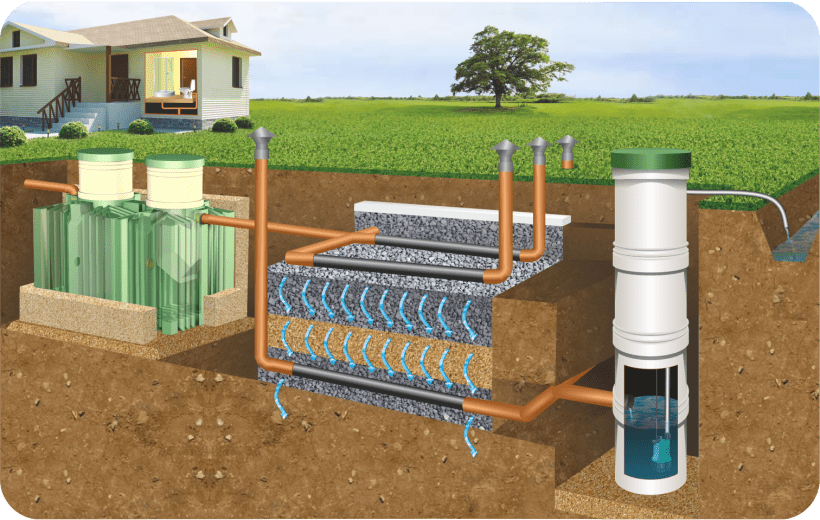 - Септики. Система из нескольких связанных между собой емкостей (две — три, реже больше). В первую попадают сточные воды, где отстаиваются, перерабатываются бактериями. Нерастворимые остатки оседают а дно, вода поднимается наверх. При очередном поступлении стоков, уровень поднимается, отстоявшаяся вода переливается в следующую емкость. Тут «живут» другие бактерии, которые завершают очистку (до 98%). Из второго отделения септика жидкость можно выводить для дальнейшей фильтрации в грунт. Она уже практически чистая. Конструкция простая, ломаться нечему. Недостаток — само устройство объемное, плюс необходимо поле фильтрации (куда будут отводится воды), раз в год-два очистка септика от нерастворимого осадка.