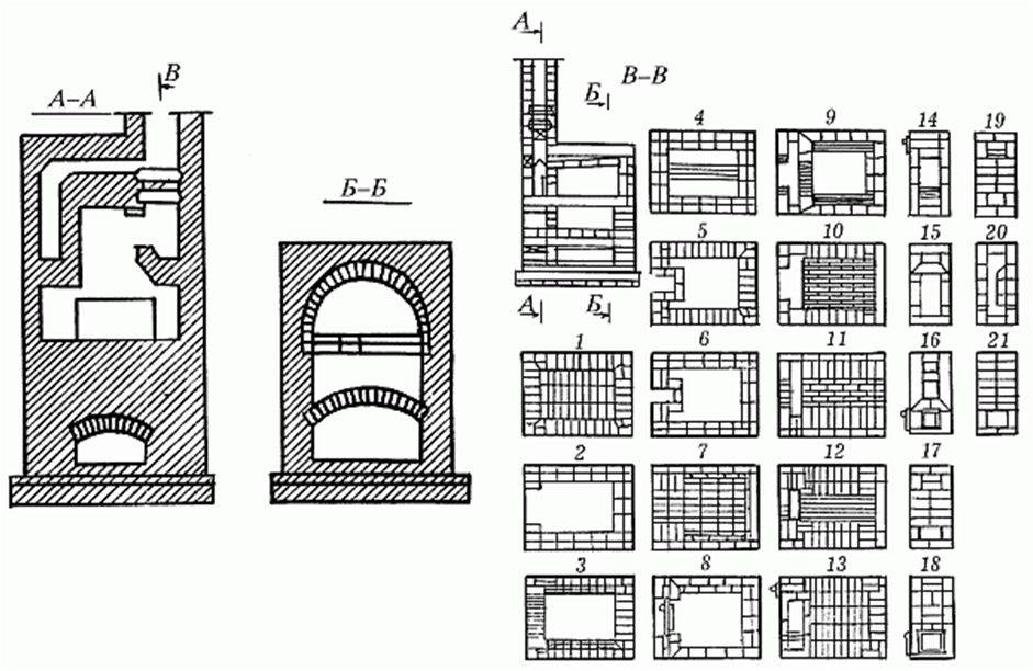 При кладке простых кухонных плит и кухонных плит с духовкой применяют дымовые трубы с площадью внутреннего сечения около 170 см , которые выкладывают по 4 кирпича в ряду (рис. 9,а). Площадь сечения дымовых труб отопительных и отопительно-варочных печей должна быть около 325 см². Трубы выкладывают по 5 кирпичей в ряду (рис. 9,б). Русские печи должны иметь дымовую трубу с площадью внутреннего сечения около 625—650 см²; их выкладывают по 6 кирпичей в ряду (рис. 8,в).