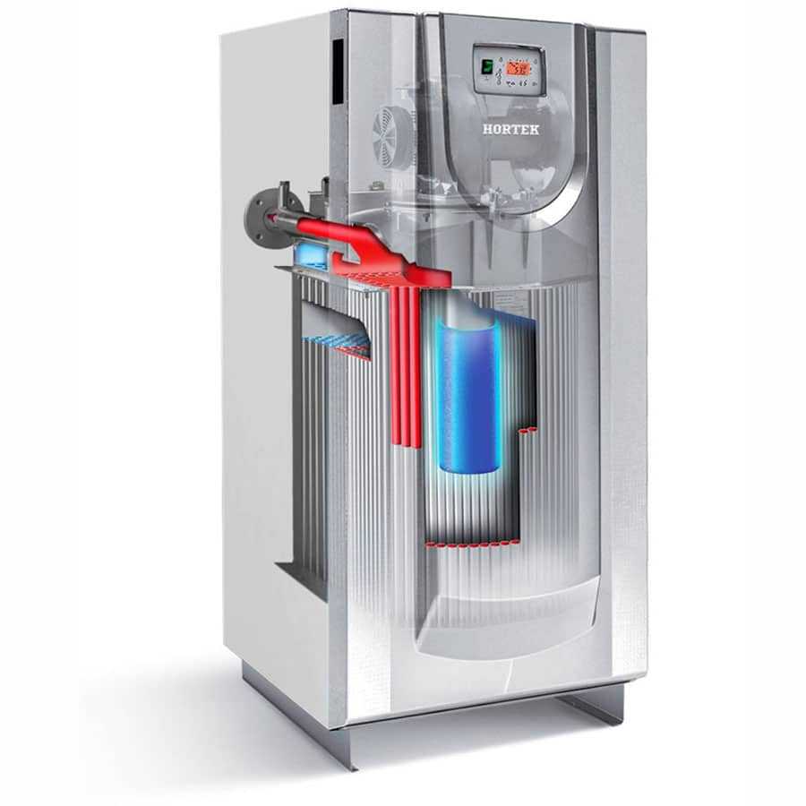 Вода, выполняющая роль теплоносителя, движется в направлении, противоположном движению парогазовой смеси. Холодная вода (обратная вода системы отопления) предварительно подогревается в конденсационном теплообменнике. Затем она поступает в первичный теплообменник, где нагревается до более высокой температуры, заданной пользователем.