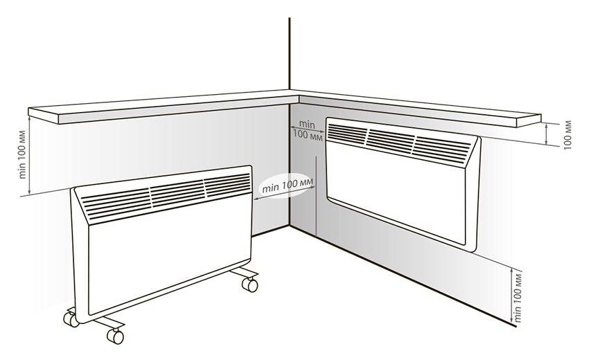 - Минимальная высота от низа конвектора до плоскости пола составляет 20 см;