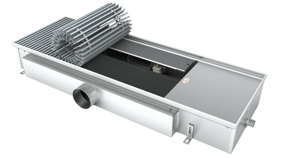 Этот внутрипольный конвектор предназначен для обогрева сухих помещений. Он изготавливается с вентилятором. Его ширина составляет почти 260 мм, а высота достигает 90 мм. Теплообменник у этой модели медно-алюминиевый. Корпус изготавливается из нержавеющей стали. Данные аппараты являются практически бесшумными в процессе эксплуатации.