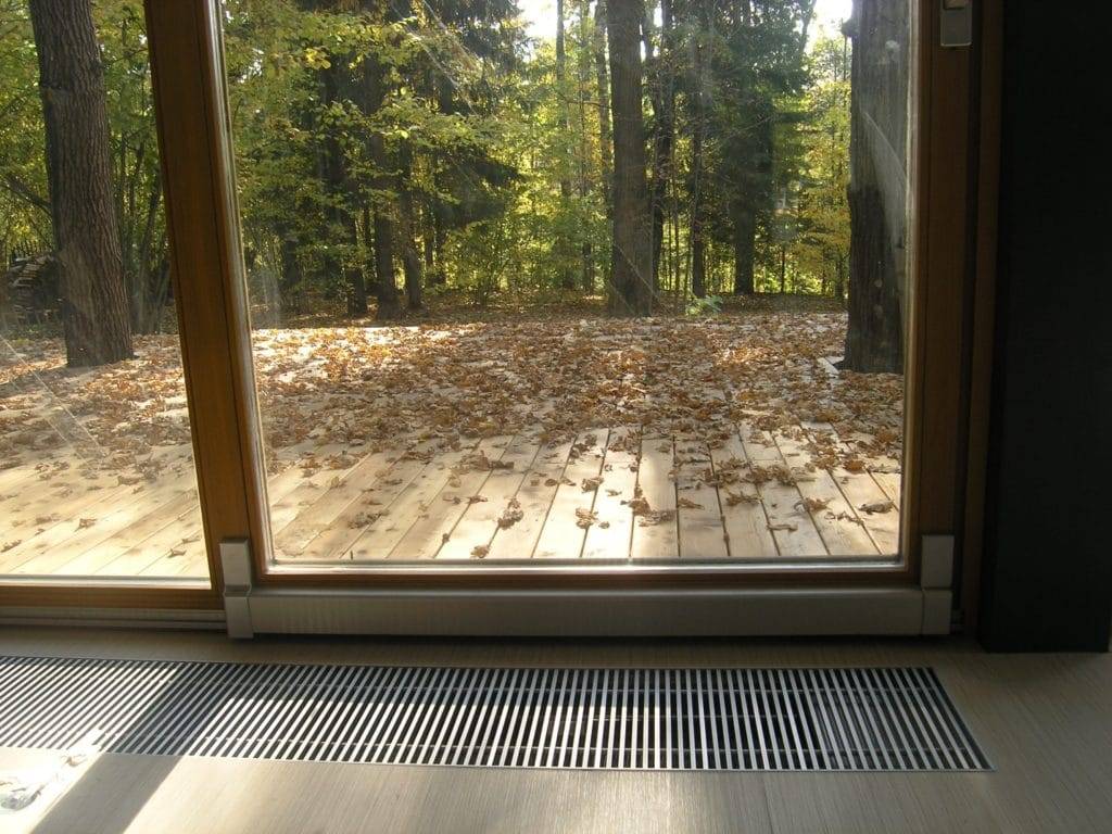 Фото 2. Внутрипольные конвекторы отопления, расположенные в частном доме возле панорамных окон.