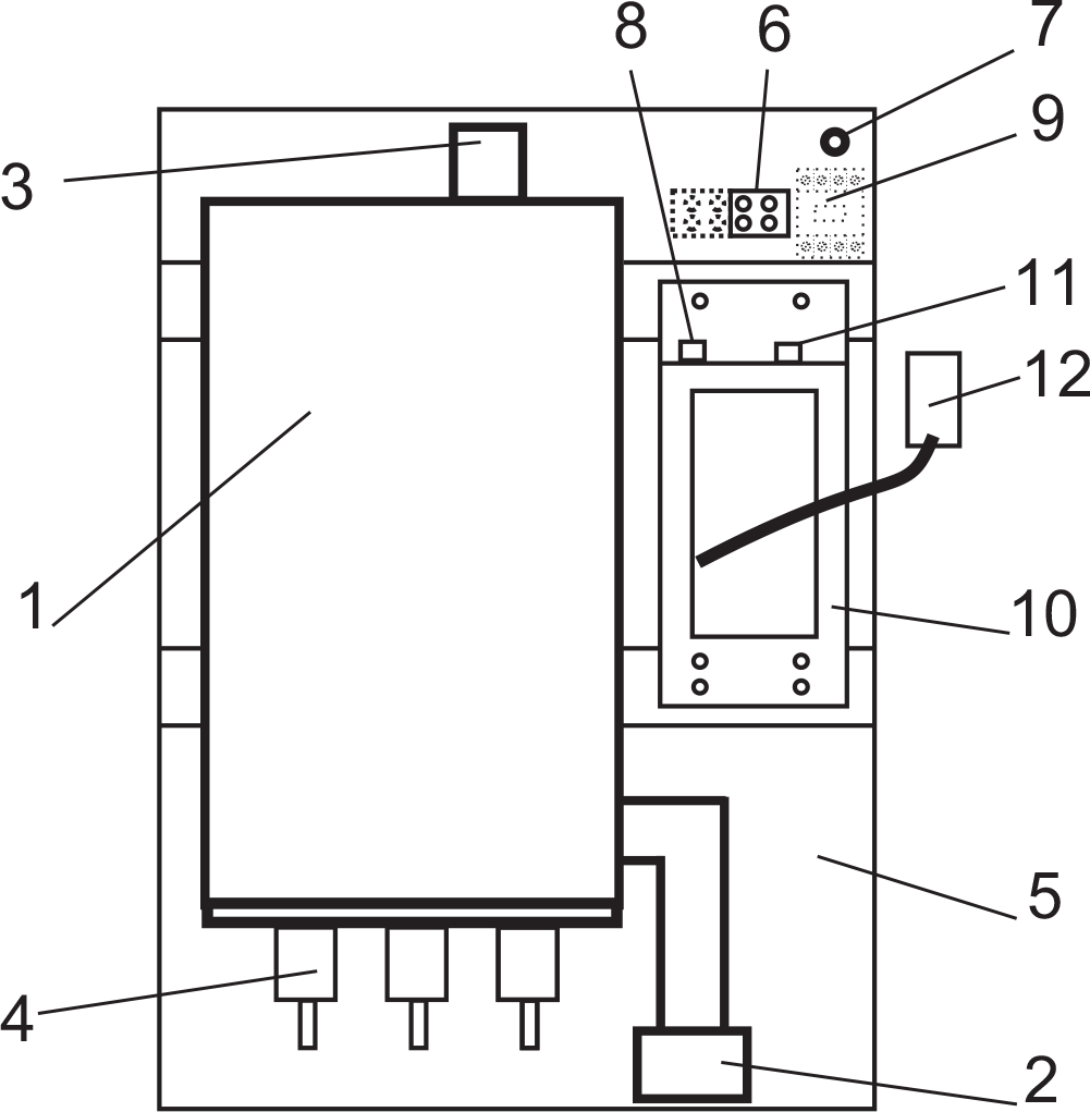 1 — котёл 2 — входной патрубок G 1¼ 3 — выходной патрубок G 1¼ 4 — ТЭН с трубками из нержавеющей стали 5 — задняя панель 6 — зажим винтовой 7 — сетевой кабель и зажим для защитного проводника РЕ 8 — зажим винтовой для подключения циркуляционного насоса и датчика температуры воздуха 9 — контактор для аварийного отключения ТЭН (для W-7,5-12) 10 — блок управления с мембранной клавиатурой и шлейфом 11 — предохранитель цепи подключения циркуляционного насоса 12 — мембранная клавиатура и шлейф
