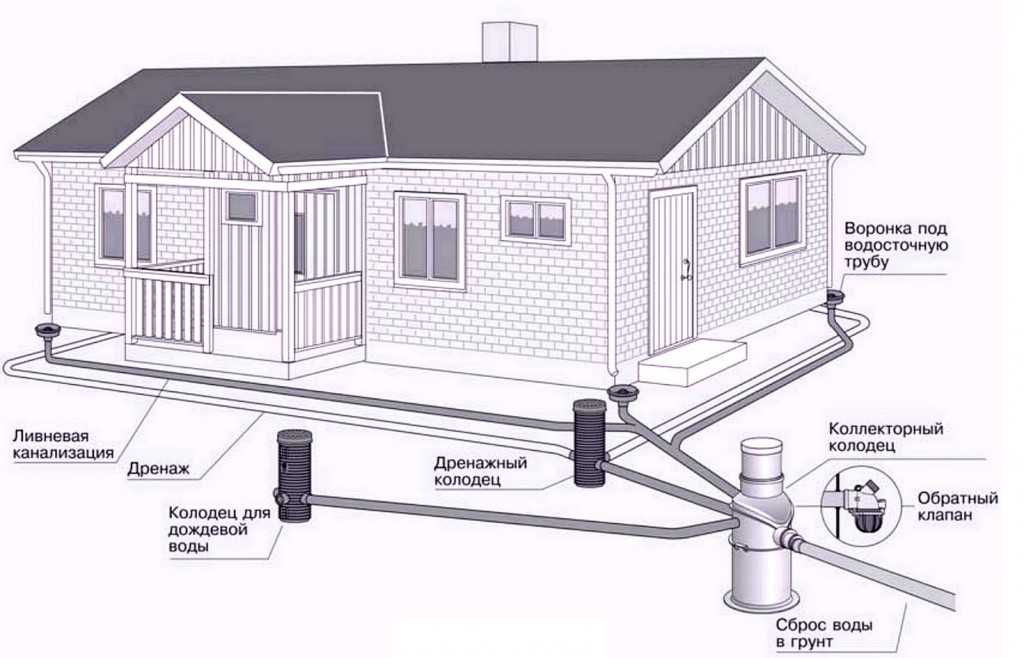 Основными объектами защиты являются фундамент и подвал. Для отсечки стоков по периметру отмостки надо сделать замкнутый дренажный контур из лотков открытого типа. Он соединен с приемными элементами водосточной системы кровли (дождеприемниками). Стоки попадают в открытые желоба, откуда направляются в коллекторы. Если позволяет состав грунта, из колодцев вода впитывается в почву и никуда больше не отводится. Такая схема удобна, но на практике она возможна не всегда. Поглощение влаги — процесс медленный, во время сильного ливня коллектор быстро переполнится, и стоки разольются по всей площади участка. В таких ситуациях либо выбирают емкость, соответствующую максимальному объему стоков, либо используют схему ливневки для двора с отводом в канализацию. Если грунт на участке глинистый и не позволяет воде впитываться, прокладывают подземные трубопроводы с присоединением к магистральной ветке ливневой канализации.