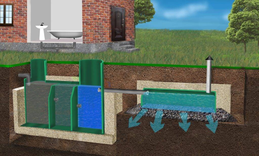 - Изделия с механической фильтрацией стоков и почвенной доочисткой – это конструкции, состоящие из двух отсеков с переливом. На фото такие устройства могут выглядеть в виде изделий, состоящих из двух отдельных ёмкостей, или единого резервуара с отсеками внутри. На многочисленных видео в сети наглядно показан принцип работы этого сооружения, при котором стоки от дома сначала попадают в камеру отстойник, где твёрдые частицы оседают на дно, а потом перемещаются во вторую камеру для биологической доочистки. После этого сточные воды подаются на поля фильтрации, где после очистки они впитываются в грунт. Очищенные воды можно использовать для полива огорода и технических нужд.
