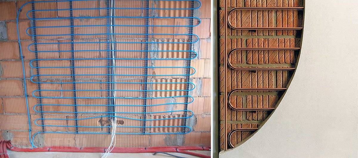 Панели, устанавливаемые на стены, представляют собой модульные блоки из медной трубы, теплоносителем в них выступает горячая вода. Теплопередача лучевого тепла у стеновых панелей с циркулирующей горячей водой при температуре 40 °С составляет порядка 80%, остальные 20% приходятся на конвекцию — это связано с допустимо высокой температурой теплоносителя, превышающей предельно установленные европейскими стандартами 30 °С для «тёплого пола».