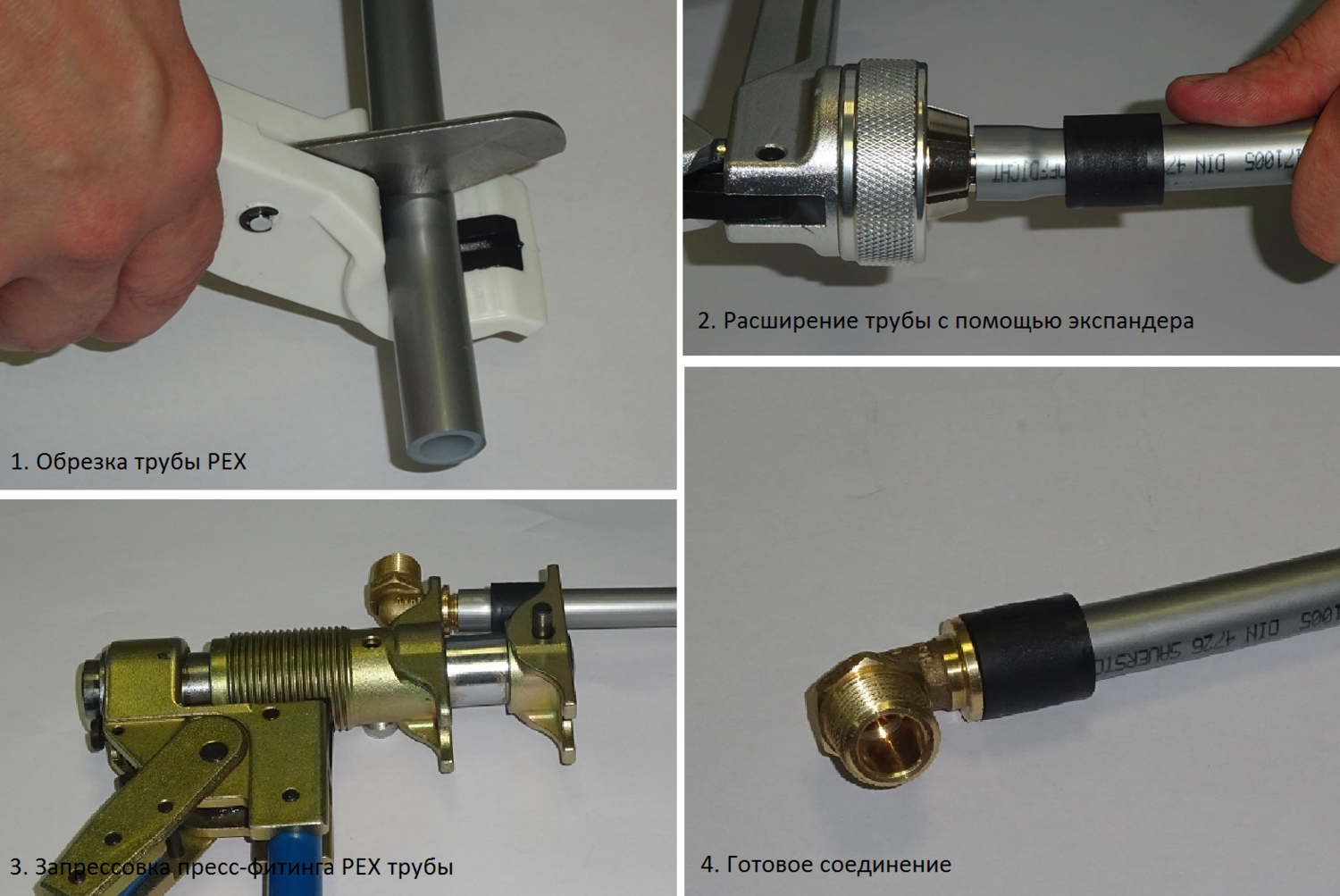 Опрессовочный способ соединения РЕХ-труб производится при помощи особого ручного инструмента – расширителя. На один конец стыкуемых труб надевают опрессовочное кольцо, затем при помощи расширителя этот конец расширяется до тех пор, пока в него не будет свободно входить фитинг.