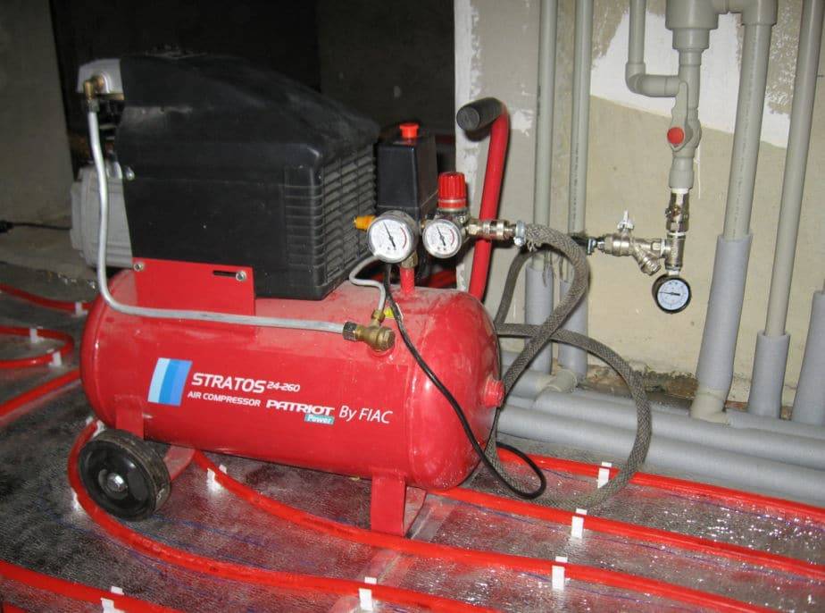 После установки теплого пола его опрессовка может быть выполнена воздухом. Этот способ применяется в том случае, если отсутствует возможность проверить трубы наполнением их водой.