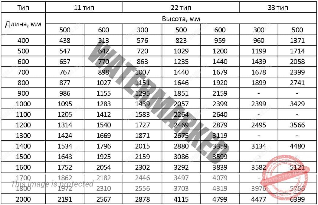 Для удобства приводим таблицу тепловой мощности стальных радиаторов (значения приведены в Вт).