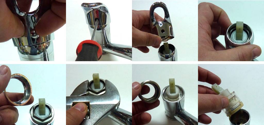 Как уже отмечалось ранее, использовать картриджи намного удобнее, чем кран-буксы, но если первые выйдут из строя, то потребуется замена сразу всего механизма. Последовательность действий приведена ниже.