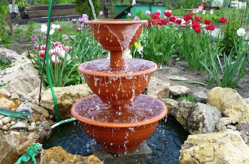 - Для создания давления для потока воды, чем всегда занимается насос в стандартной конструкции фонтана, используют три емкости различного объема (высота, ширина). Устроить такую систему довольно просто, воспользовавшись баками, которые есть на любой даче или в гараже. Так, вы сумеете сэкономить расходы на материалы.