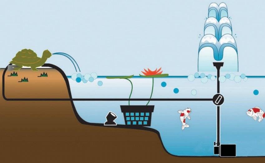 Техническое оснащение фонтана осуществляется с насоса. Их назначение — подавать жидкость к фильтрам и фонтанным установкам для организации ручьёв и каскадов. Это специальные насосы, способные непрерывно функционировать в течение длительного времени, обеспечивать «круговорот воды» в водоёме на протяжении не одного сезона. Им не страшны взвеси и крупные частицы грунта, которые содержатся в воде и могут вывести устройство из строя.