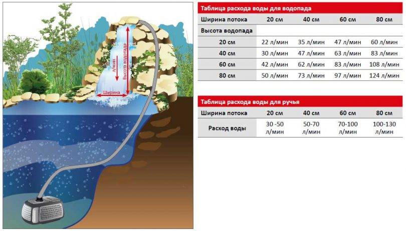 Чтобы поднять воду на заданную высоту, насос должен иметь соответствующую напорную мощность. Известные производители предлагают покупателям помощь – специальные таблицы для подбора насоса. В них учитывается производительность модели, а также параметры водопада: его высота и ширина потока воды (в см).